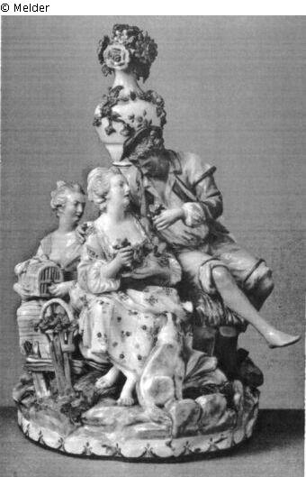 Gruppe: Liebespaar mit Vogelnest und Dienerin mit Vögelkäfig