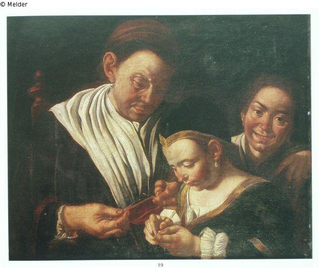 Eine auf einem Lehnstuhl sitzende alte Frau unterweist ein kleines Mädchen in einer Handarbeit. Rechts eine zweite Frau. Die Alte in rotem Kleid mit weißem Schal, das Kind in grünem, mit goldener Borte eingefaßtem Kleid mit schwarzen Käppchen. Dunkler Grund; Abb.: Répertoire des biens Spoliés en France, Nr. 50