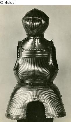 Helm und Brust geriefelt. Helm runde Glocke mit flachem Kamm. Visier mit vertikalen Sehschlitzen. Am Bruststück Ränder geschnürlt. Bauchreifen und Beintaschen. Rücken aus drei Folgen. Kragen glatt. Armzeuge fehlen. Eingeschlagen Meistermarke: Helm mit Zimier in Form einer Lilie und die Buchstaben V S; Herstellungsort: Nürnberg. Brust mit Beintaschen: 63 cm lang, Gewicht: 12.660 g