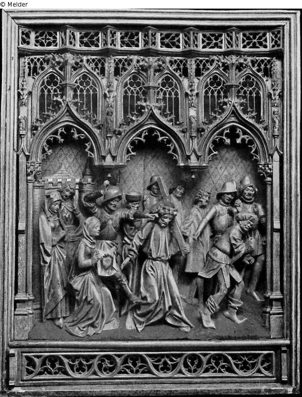 mit freistehenden und hoch reliefierten Figuren, farbig gefasst und reich vergoldet; Christi Kreuztragung, im Vordergrund die Heilige Veronika mit dem Schweißtuch, hinter dem Heiland hergehend im Hintergrund die beiden Schächer und Kriegsknechte