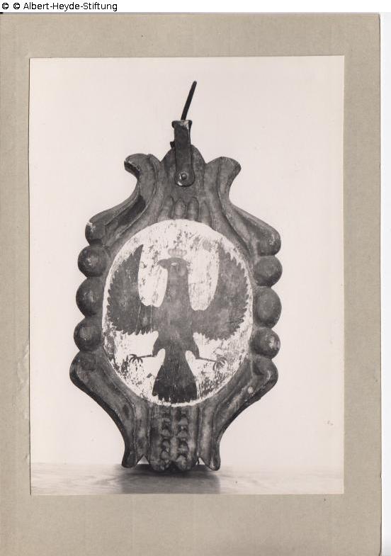 Zeichen für den Bierausschank in der Stadt Lübben. Gestaltet als farbig gefasste barockisierende Kartusche. Aufschrift der Vorderseite: "Lübbener Bierzeichen 1845".