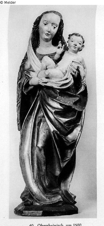 Die Heilige stehend auf Terrainsockel, mit langen Haaren, Kopftuch, in faltenreichem Mantel, hält mit beiden Händen das segnende Christuskind, vollrund, mit alter Fassung