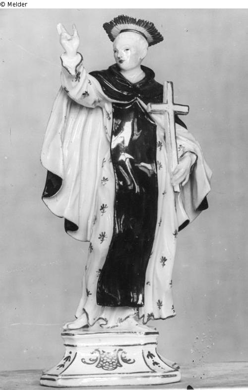 Meissener Porzellanfigur, darstellend den Heiligen Nepomuk mit Strahlenkrone, das Kreuz in der Linken haltend, die Rechte erhoben. Bekleidet mit goldgeblümten Gewand und schwarzem Pluviale, rosa abgefüttert. Das rechte Spielbein zeichnet sich am Knie durch das Gewand. Der Sockel ist leicht mit Gold dekoriert.