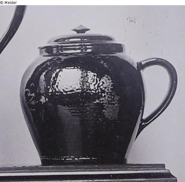 Henkeltopf mit Deckel. Braune Glasur mit Vergoldung.