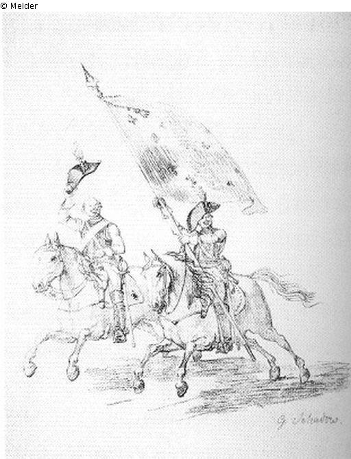 Szene aus Friedrich II., der Siegende bei Roßbach am 5. November 1757; Schadow Inv.Nr. 708; (Mackowsky Graphik Nr. 139, S. 126, Tafel 170); Signatur: Rechts unten: G. Schadow