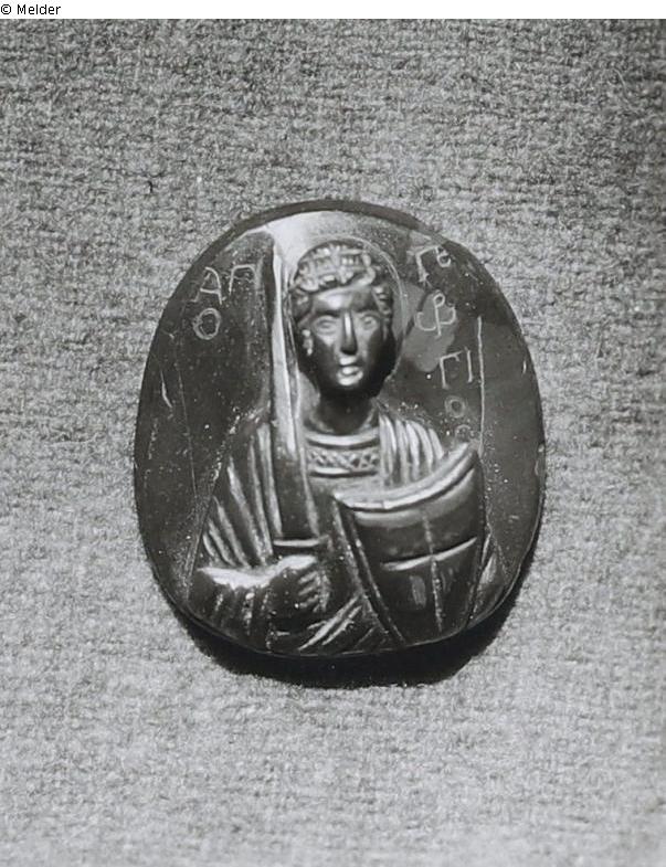 Ovaler Heliotrop, in hohem Relief Brustbild des heiligen Georg – ΑΓΙΟ Γε ωρ [ligiert] ΓΙ ΟϹ (Nachbildung)