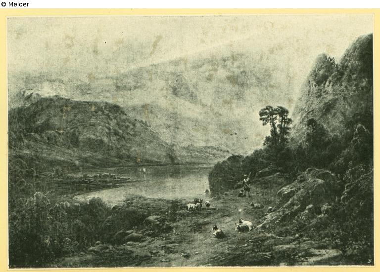 Tafelmalerei: Bild: Gebirgszug, Schneegipfel & Tal & See & Bauernhof oder abgelegenes Haus in einer Landschaft & Baumgruppen & Ziege & abendliche Landschaft (manchmal benannt als: Vesper)