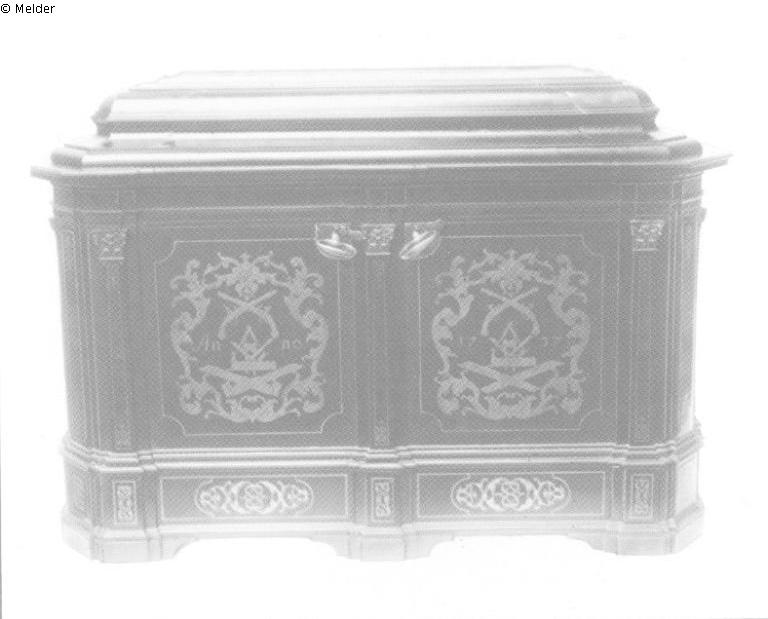 Innungslade der Dresdener Tischler- und Büchsenmacher-Zunft. Zuckertannenholz in Ebenholz furniert, Schildpattintarsien (?) und Messingbeschläge. Auf der Vorderseite zu beiden Seiten der Tischlerwerkzeuge datiert: Anno 1737. Auf den Korpusseiten je eine bewegliche Handhabe. Meisterstück von Gottfried Schubert aus Schlesien; Lade ist >>von Zuckerdannenholtz, Schwartz Eben und Schilkröte und Messing fourniert<< [...]. Maße unbekannt. Bis 1881 im Besitz der Dresdener Tischlerinnung, seitdem im Stadtmuseum Dresden, 1945 verbrannt.