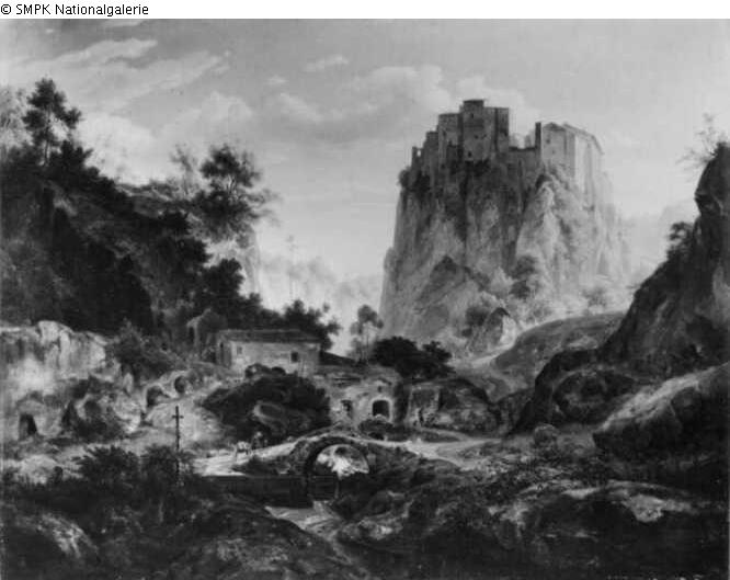 Tafelmalerei: Bild: Felsen & Stadtansicht (allgemein); Vedute & Schlucht, Felsspalte, Abgrund, Canyon & Landschaft mit einer Brücke, einem Viadukt oder Aquädukt