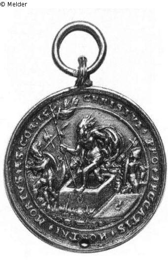 Medaille, gehenkelt mit beweglichem Silberring, unten eine Durchbohrung. Vs.: Rechts entsteigt der bärtige Jonas dem Walfischrachen. Am Ufer stehen Bäume, und links im Hintergrund sieht man eine Stadt. Umschrift: VT IONAS IN PISCE TRIDV VM ITA ET FILI DEI IN SEP IO I (Interpunktion: Ringe). Rs.: Christus steigt mit der Kreuzfahne in der Hand aus dem Sarkophag. Um ihn herum sieht man die erschrockenen Soldaten, einer von ihnen versucht zu fliehen. Umschrift: CHRISTVS PRO PECCATIS NOSTRI MORTVS ES COR : 15 (Interpunktion: Rhomben).