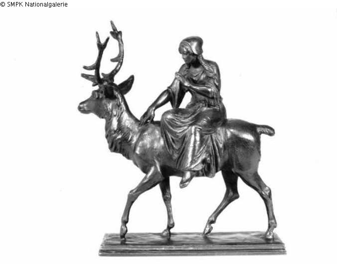 Freiskulptur: Mensch-Tier-Gruppe: auf einem anderen Tier (keinem Pferd) reiten: Esel, Maultier, etc. & Huftiere: Hirsch