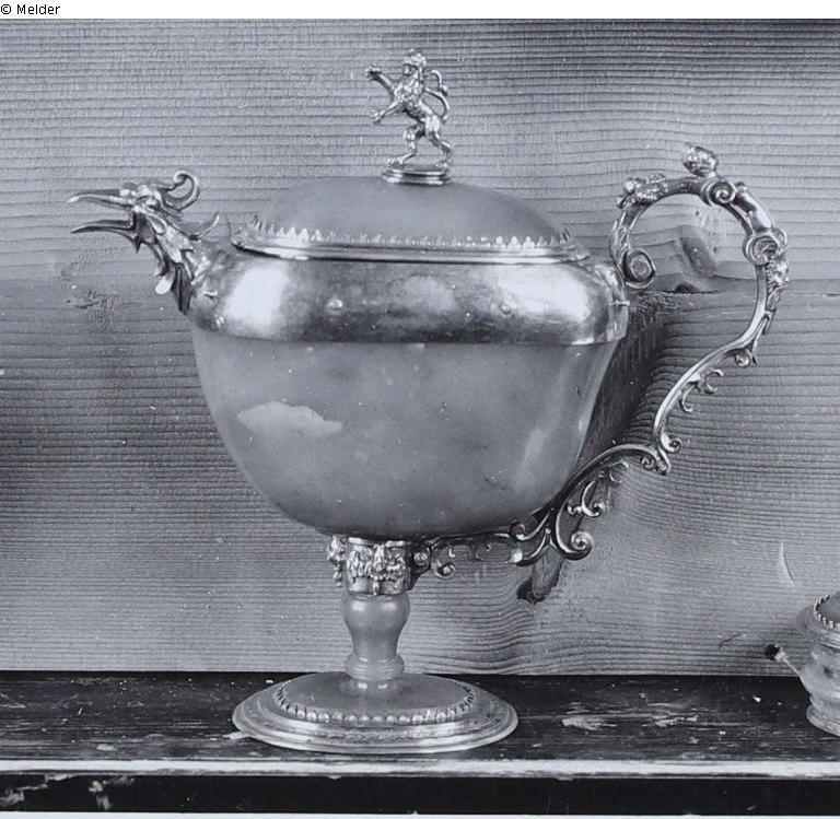 Kanne mit Ausguss in Gestalt eines Vogelkopfes. Auf dem Deckel ein Löwe aus vergoldetem Silber. Henkel und Beschlag ebenfalls aus vergoldetem Silber. Hat eine sprungähnliche Ader.