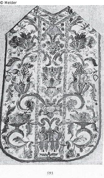 Stickerei in farbiger Seide, Gold und etwas Silber auf weißer Seide. Sichelförmige Blätter mit Schalen, darauf Früchte, ebenso Palmetten mit Früchten und Blumen. Zwei senkrechte Goldborten teilen die Fläche. Rosa Seidenfutter.