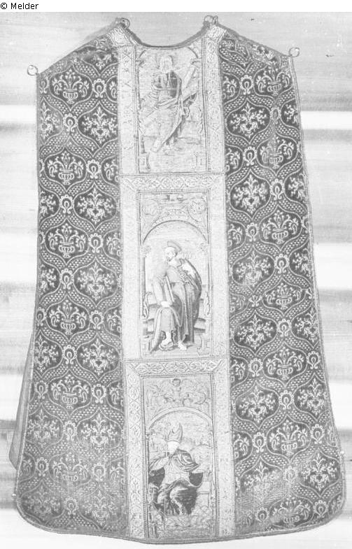 roter geschlitzter Samt, aufgelegte Borte mit Medaillons in Nadelmalerei zwischen Rankenornament, vorn in Halbfigur: Maria mit dem Kind und Heiliger, Rückseite: Johannes, Paulus und Jacobus (?), die vorderen Darstellungen defekt, zwei Teile