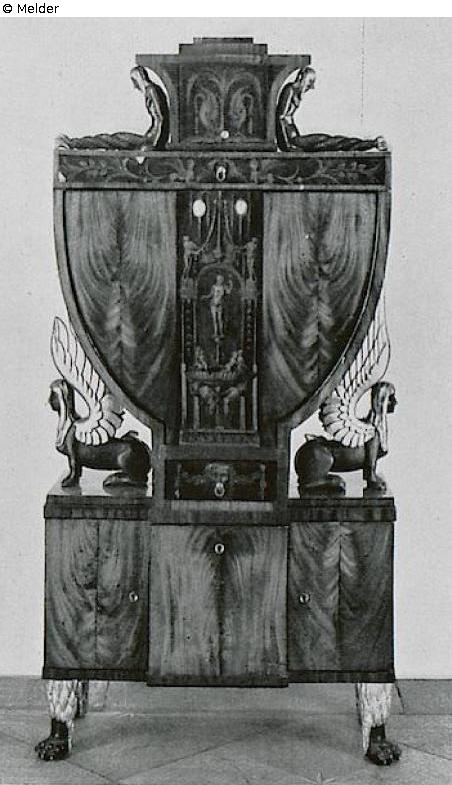 Mahagoni, mit Intarsien. Auf kastenförmigem, dreitürigem Unterteil, mit bronzefarbenen, zum Teil vergoldeten Löwenpranken, das schildförmige Oberteil mit Schreibklappe und geschweiftem Aufsatz. Oberteil und Aufsatz mit antikisierenden, figuralen Intarsien auf schwarzem Grunde verziert und von geschnitzten, bronzefarbigen, zum Teil vergoldeten Tritonen und Sphinxen flankiert. Wien, Anfang 19. Jahrh. Literatur: Auktionskatalog Hans W. Lange, Wertvolles Kunstgewerbe, Berlin, 19.-21. Mai 1941, S. 30. Nr. 106, Taf. 22 (DOI: Externer Link)