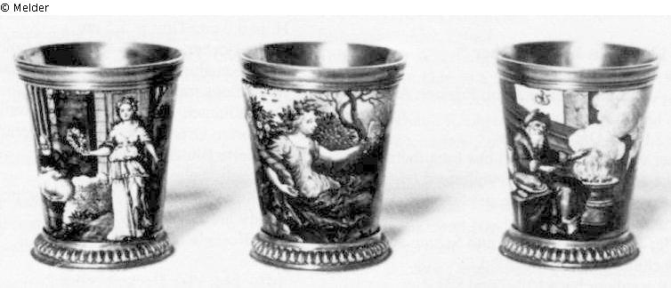 Einer von sechs kleinen Bechern, konische Form mit Emailbemalung von J.J. Priester: Monatsdarstellungen (signiert "J.J. Priester. Pin."). Zu Ahv 366 gehörend.