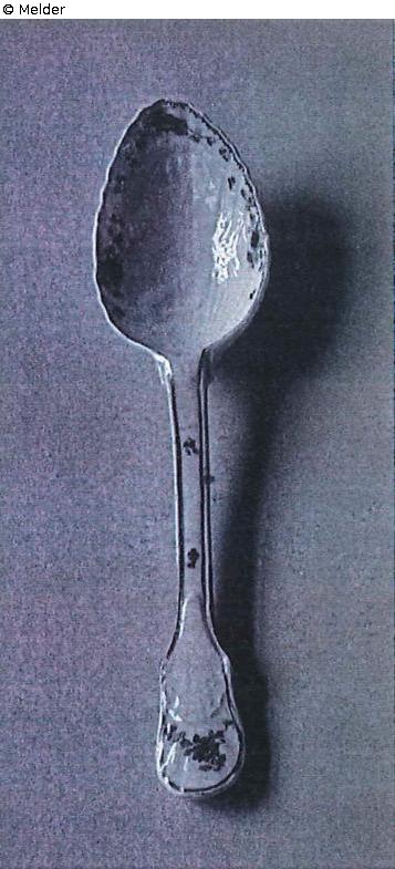 Ohne Marke; Der Speiselöffel folgt in verkleinertem Format der Form des Vorlegelöffels. Der Speiselöffelist, wie der grosse Vorlegelöffel, am oberen Ende des Stiels spatenförmig verbreitert und mit erhabenem Mushelrelief verziert, während das Schwanenrelief mit den beiden im Wasser schwimmenden Schwänen und dem im Schilf stehenden sowie einem zweiten ind er Luft schwebenden Reiher in der ovalen Laffe erscheint. Auf der Unterseite des Spatenstiels befindet sich das gemalte Allianzwappen Brühl-Kolowrat- Krakowsky und auf der Oberseite eine "indianische" Blüte. Weitere Blüten dieser Art sind in Dreieckskomposition unter dem inneren Rand der Laffe verteilt. Eine Goldlinie umgibt die gesamte Form, von der im Beriech des Schöpfteils eine Goldbordüre aus stilisierten dreizacking Blättern abhängt.