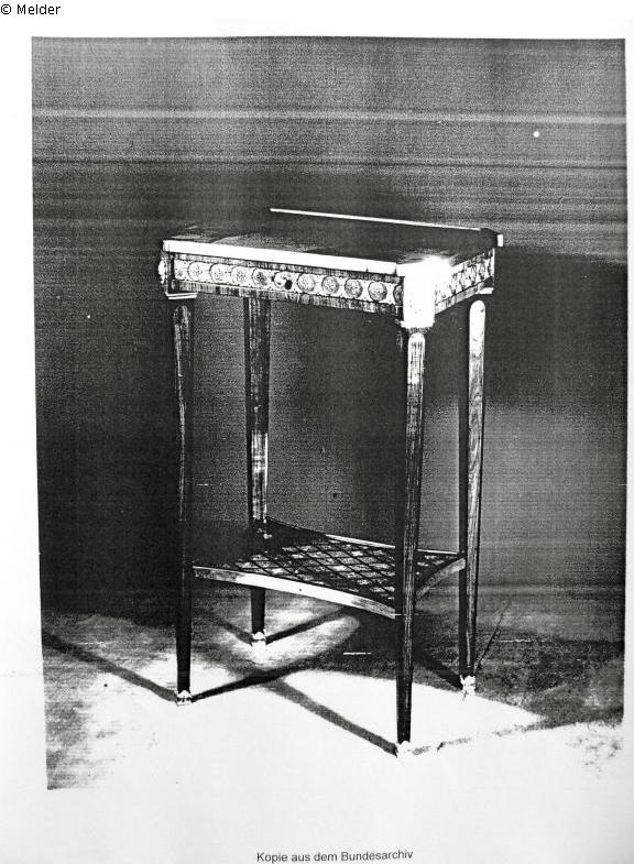 Suchmeldung | Einzelobjekt Kleiner Tisch Lost Art-ID422678 Vorherige Weiter Vergleichsabbildung Vergleichsabbildung Hersteller/Künstler:in Unbekannt TitelKleiner TischObjektartMöbelObjektgruppeKunsthandwerk / -gewerbeMaterial / TechnikHolz (Rosenholz)Beschreibung Epoche Louis XV; Gestempelt von Boudin; Bei den gezeigten Abbildungen handelt es sich um Vergleichsabbildungen Weiterlesen Weniger anzeigen Provenienz Sammlung Edouard Jonas, 1940 Beschlagnahme/Entziehung im Auftrag von Göring durch Staatsmininster Engerer in Bordeaux im September 1940 Weiterlesen Weniger anzeigen Veröffentlicht seit2010 Ansprechpartner:in von Trott zu Solz LammekPositionRechtsanwälte NotarTel+49 (0) 30 59 00 33 0-0E-Mailkanzlei@vontrott-lammek.de