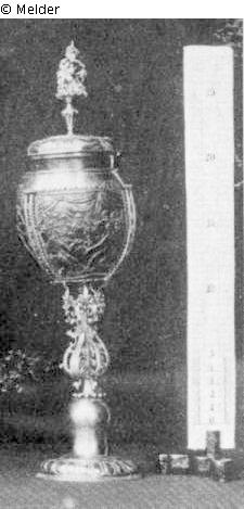Die aus Kokosnuß bestehende Kuppa ist mit drei reliefierten Szenen versehen - dem Abendmahl, der Fußwaschung und einer Darstellung mit einer Frau vor einem Richter, die ihre rechte Hand in den Rachen eines Löwen steckt. Hinter der Frau ein Narr. Beschlag und Deckel aus vergoldetem Silber sind mit erhabenem Ornament versehen. An Nodus und Deckelknauf befinden sich silberne Blumen.