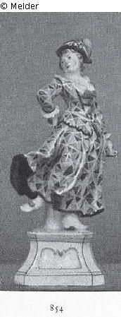 Achtteilige Folge, Inventarnummern 849 (Gaupe) - 856 (Gaupe); Gegenstück zu Harlekin (Katalognummer 853). In tänzelnder Stellung mit erhobenem rechtem Bein und auswärts gedrehten Füßen wendet sie den Kopf nach rechts zum Partner. In der linken Hand hält sie die Pritsche, die rechte Hand mit gekrümmten Fingern liegt an der Hüfte. Golden geränderter schwarzer Hut mit roter, blauer und purpurner Straußenfeder und roter Rosette. Weiße Halskrause und Manschetten. Mieder und rot geränderter Rock aus hellgrünen, roten und hellblauen Dreiecksflicken mit gelben Borten. Gelbe Schuhe mit blauen Schleifen. Postament und Stütze wie vorher. Marke: Sechsspeichiges eisenrotes Rad. Ritzzeichen RI.