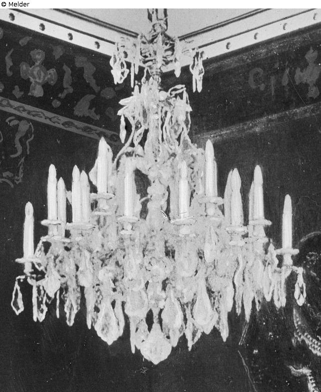 Dresdner Schoss, 2. OG Westflügel, Chinesisches Zimmer; Im Inventarverzeichnis Nr. 1 vom 31.01.1920, als Bestandteil des Auseinandersetzungsvertrages des Freistaates Sachsen und dem vormaligen Königshaus von 1924, aufgeführt, welcher als rot angekreuztes Rauminventar dem Staat zufällt. Ein genauer Bergungstermin ist nicht aktenkundig, die Bergungsmaßnahmen wurden im Sommer 1944 beendet. Der Kronleuchter des Chinesischen Zimmers wurde wahrscheinlich mit dem Transport vom 26.04.1944 nach dem Bergungsort Schloss Rammenau verbracht. Zu den Verlustumständen dieses Objektes ist nichts bekannt.Ein Verlust im Zusammenhang mit den Ereignissen des 2. WK wird vermutet.