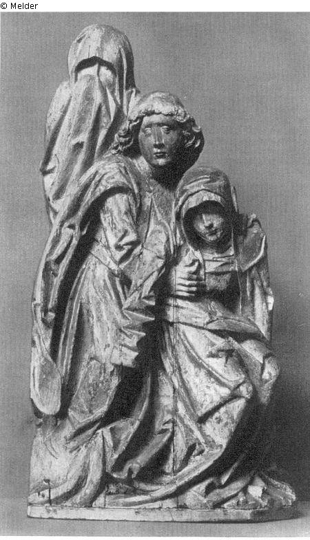 Große Gruppe von einer Kreuzigung. Johannes stützt die zusammenbrechende Maria, dahinter Maria Magdalena, Holz, Rücken abgeflacht u. ausgehöhlt, Spuren alter Fassg., darüber weiß- grüne Barockbemalung