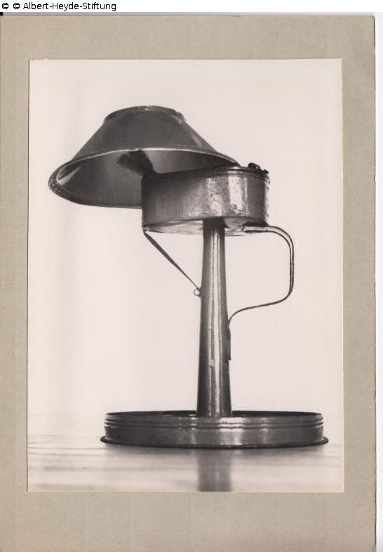 Gänzlich aus Blech gefertigte Tischlampe mit rundem Fuß, konischem Ständer mit Henkel und ovalem Ölbehälter. Aufklappbarer, grünlackierter Lichtschirm ohne Luftzuführungs-Zylinder.
