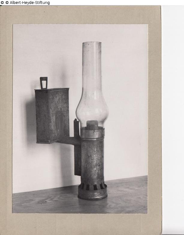 Zylindrischer Dochtbehälter, darauf ein gebauchter Glaszylinders. Rückseitig ein kastenförmiger Ölbehälter mit Öse zum Anhängen an die Wand. Ein Lichtschirm war vermutlich nie vorhanden.