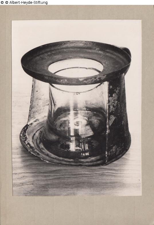 Konisches Blechgefäß mit Henkel und Standfläche für das Licht, die Stirnseite ausgeschnitten. Darin ein ebenfalls konischer Glasbecher als Ölbehältnis.
