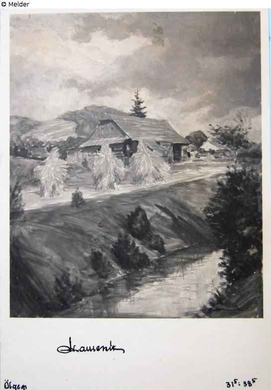 Landschaft mit Bach und Bauernhaus