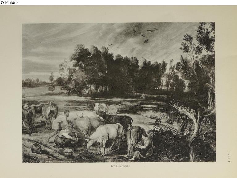 Siehe Katalog der Kollektion Baron Albert Oppenheim, Köln (1914), Seite 62 Abbildung 32. Der Katalog vermerkt darüber: Dieses Bild scheint einer späteren Zeit anzugehören, als die gleiche Darstellung in der Pinakothek zu München (Nr. 760). - Das Münchener Gemälde ist nach untenzu vergrößert worden, so daß die Frau im Vordergrund weniger nah an den Rahmen heranreicht. Das Bild zeigt auch ein Tier mehr. Exzellenz W. v. Bode sagt über das Bild im Vorwort des Kataloges Oppenheim: P. P. Rubens ist mit einer seiner großstiligen Landschaften vertreten. - Weiters führt der Katalog Oppenheim noch an: Vielleicht identisch mit einem Gemälde der Versteigerung Spruyt in Gent 1815 (Rooses, IV, P. 390). Goldrahmen