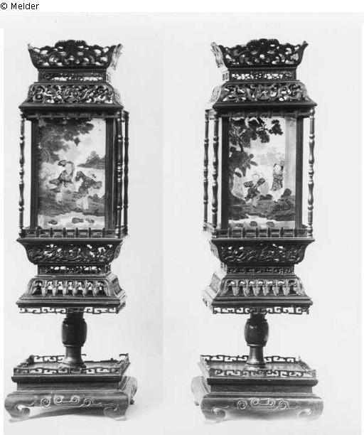 Ein Paar Laternen, Holzschnitzerei mit bemalten Glasplatten (unterschiedliche Bildmotive)
