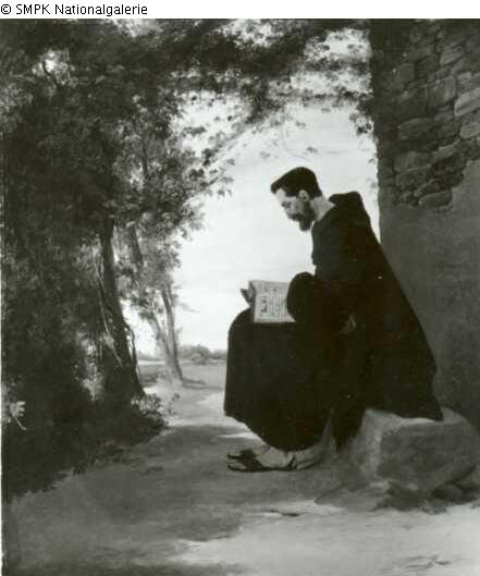Tafelmalerei: Bild: Mönch(e), Klosterbrüder & Franziskanerorden & das Lesen der Bibel oder anderer religiöser Bücher & auf einer Erhebung sitzen & geöffnetes Buch & Bäume
