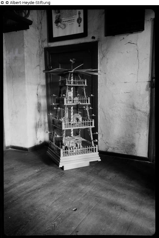 Viergeschossige Weihnachtspyramide, zur Drehung durch die thermischen Energie aufgesteckter Kerzen. Auf den eingezäunten Plattformen wurden kleine Motive inszeniert, zuunterst eine Weihnachtskrippe.