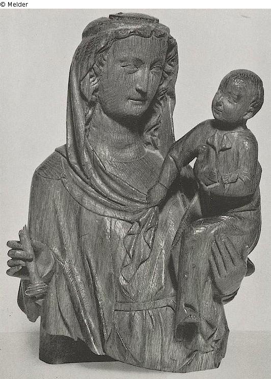Das auf dem linken Arm sitzende Kind hält mit der Rechten das Kopftuch der Madonna, in der Linken einen Vogel. In der rechten Hand der Madonna Zepter. Dieses und die Hand, sowie linker Arm des Kindes ergänzt. Zur Halbfigur abgeschnitten. Vollrund. Unter französischem Einfluss.