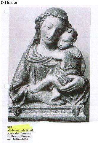 Madonna in Halbfigur, mit Kopftuch und weitem Mantel. Der rechte Arm liegt vorn; mit der Linken hält sie das sich anschmiegende Kind. Auf Sockel Inschrift: Ave Maria. Stukko, polychrom, Rückseite hohl, alte Bemalung. Vgl. die ganze Gruppe von Madonnenreliefs, von der sich Exemplare im Kaiser-Friedrich-Museum (von v. Bode Ghiberti zugeschrieben), im Bargello in Florenz, im Louvre in Paris nun befinden.