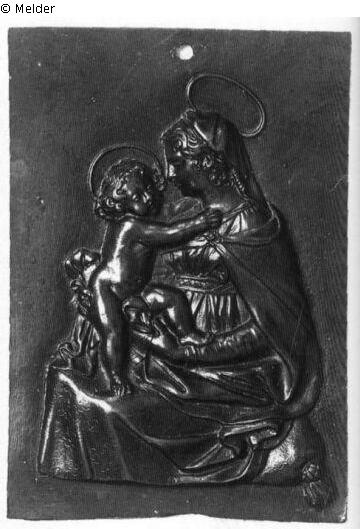 Rechteckige Plakette, flacher Grund, oben in der Mitte eine Durchbohrung, auffallend hohl gegossen. Die Madonna sitzt nach links gewendet auf einem Kissen. Sie hält das nackte Kind, das mit einem Fuß auf ihrem Knie steht und die Hände an ihren Hals legt. Wahrscheinlich stammt die Plakette von demselben Meister wie die beiden vorhergehenden Stücke.