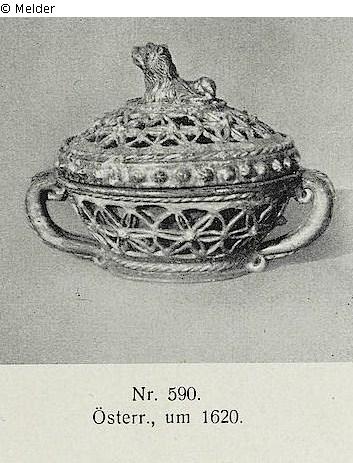 Dorotheum: 590 Schüssel aus Hafnerkeramik, gedeckelt, grün glasiert, doppelwandig, der äußere Mantel ornamental durchbrochen, am Deckel liegender Löwe als Knauf, mit zwei konturierten Volutenhenkeln, Höhe 22, Durchm. 30 cm, österreichisch, um 1620 (siehe Abbildung Tafel 41)