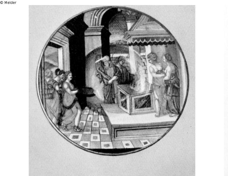mythologische Darstellung über die ganze Fläche. Auf der Rückseite Inschrift und Signum von Fra Xanto da Rovigo und Datum 1535. In Gubbio lüstriert, 1535.