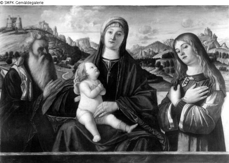 Tafelmalerei: Bild: Maria sitzt oder thront, das Christuskind sitzt auf ihrem Knie & Sacra Conversazione; Madonna; Christuskind; Knie; sitzen; links & Sacra Conversazione; heilig