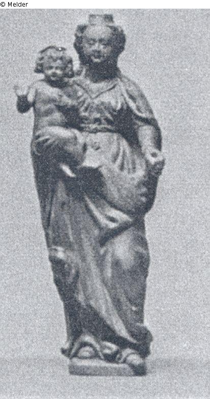 Kleine Statuette der Maria mit dem Kind, auf eckiger Plinthe stehend. Buchs. Vollrund geschnitzt, Rücken leicht abgeflacht. Die erhobenen Rechte des Christuskind leicht beschädigt, die Krone der Maria entfernt. H. 11,5cm