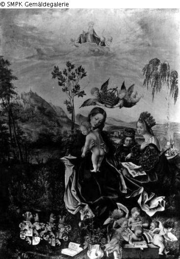 Tafelmalerei: Bild: Madonna mit Heiligen & Katharina von Alexandrien, jungfräuliche Märtyrerin; mögliche Attribute: Buch, Krone, Kaiser Maxentius, Palmwedel, Ring, Schwert, Rad & Barbara, jungfräuliche Märtyrerin; mögliche Attribute: Buch, Kanone(nkugel), Krone, Kreuz, Kelch mit Hostie, Dioscuros (ihr Vater), Pfauenfeder, Schwert, Fackeln, Steinmetzwerkzeuge, Turm & Engel, die jemanden krönen und/oder Palmzweige bringen& Berg, hoher Hügel; Heiliger & Katharina de Alexandria (Heilige); Kaiser; Palmwedel; Ring; Rad; Maxentius (Kaiser); Buch; Krone; Schwert & Barbara (Heilige); Kanone; Kanonenkugel; Kelch; Hostie; Dioscuros; Feder; Pfauenfeder; Fackel; Turm; Steinmetz (Werkzeuge des); Werkzeug; Buch; Kreuz; Krone; Schwert & krönen& Hügel; Signatur: Rechts unten: 1512/Jb (verbunden); Maße: 75 x 52 cm