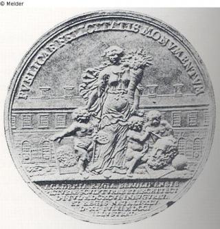 Rs.: Personifikation des Überflusses mit Füllhorn, Abundantia, vor dem Marstallgebäude, drei Putten symbolisieren die Malerei, die Bildhauerei und die Architektur; Umschrift: PVBLICAE FELICITATIS MONVMENTUVM / ACADEMIA REGIA BEROLINENSIS PICTVRAE SCVLPTVRAE ET ARCHITECT. D. I. IVL. MDCXCVI. INAVGVRATA ET REGIS NATALI XLV D. XI JVLII MDCCI ILLVSTRATA.; (Signatur) CHRISTIAN WERMVTH ALTENBVRG MISNICVS FECIT IN GOTHA CVM PRIVIL CAESAR