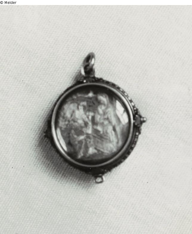 Medaillon mit zwei kleinen farbigen Bildern in Églomisé-Technik: 1. Mariä Verkündigung. 2. Ein Heiliger spricht knieend einem liegenden nackten Mann zu.