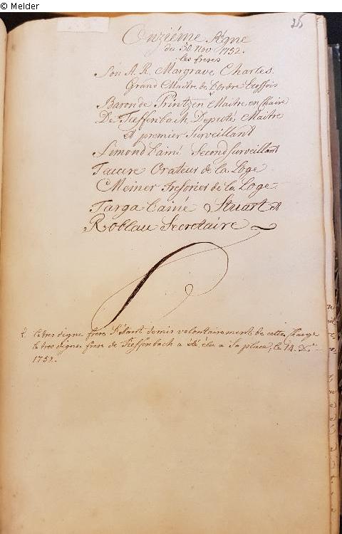 Vgl.: Noch heute im Eigentum der GNML zu den drei Weltkugeln (Depositar - Geheimes Staatsarchiv Preußischer Kulturbesitz, Berlin) weitere Archivalien der l'Union die Fortsetzung des verlustigen ersten Protokollbuches in Form des zweiten Protokollbuches; dieses seit 30.11.1752 im identischen Stil handschriftlich verfasst von Br. Roblau. Ebenso das Anwesenheitsbuch seit 1743 ff. sowie das Kassenbuch der l'Union (seit 1745).