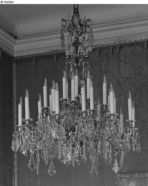 Dresdner Schloss, 2. OG Westflügel, Gelber Salon, 1890/1892 angebracht; Im Inventarverzeichnis Nr. 1 vom 31.01.1920, als Bestandteil des Auseinandersetzungsvertrages des Freistaates Sachsen und dem vormaligen Königshaus von 1924 aufgeführt, welcher als rot angekreuztes Rauminventar dem Staat zufällt; Die Auslagerung des heute vermissten Kronleuchters aus dem Gelben Salon („Boule-zimmer“) nach dem Bergungsort Schloss Kauppa (Landkreis Bautzen) erfolgte am 09.03.1944. Allerdings wurde mit dem Bergungsgut aus Schloss Kauppa, im Zuge der vom Reichsstatthalter Mutschmann angeordneten Beräumung der östlich der Elbe gelegenen Bergungsdepots und der Verlagerung des Bergungsgutes westlich der Elbe, nach Schloss Schieritz „ein mit Latten verschalter Leuchte aus dem Boule-Zimmer“ abtransportiert und „der Leuchter in der Eingangshalle im 1. Obergeschoß des Schlosses Schieritz aufgestellt“. Zu den Verlustumständen dieses Objektes ist nichts bekannt. Ein Verlust im Zusammenhang mit den Ereignissen des 2. WK wird vermutet.