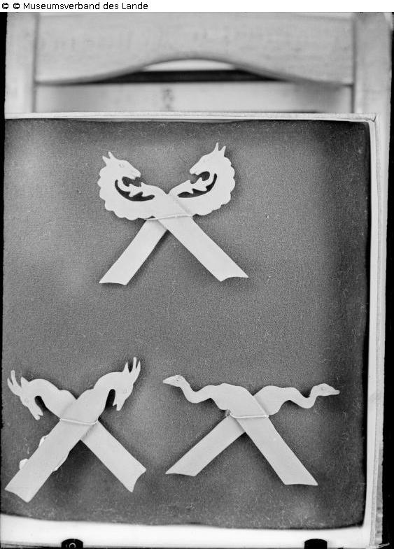 Verkleinerte Modelle von nach Tiermotiven gestalteten Giebelzeichen.