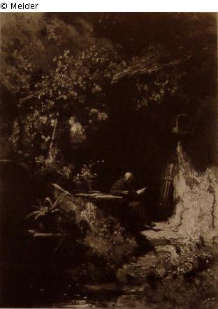 Mönch, vor seiner Behausung lesend