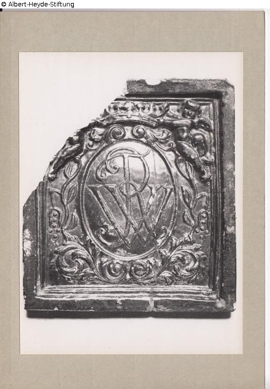 Hochrechteckige Ofenkachel mit innen gekehltem Rahmen. Von Akanthus-Franken und Lorbeer bekränzte ovale Kartusche mit dem Monogramm „FWR“ (d.i. König Friedrich Wilhelm I.), darüber eine von zwei Putten gehaltene Krone.