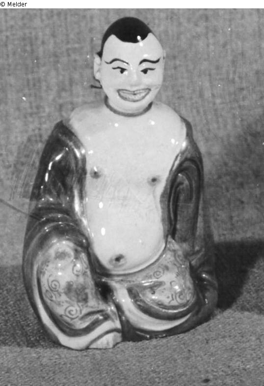 Schnorr von Carolsfeld: Pagode, Gleiches Modell wie Nr.15-18 (Schnorr von Carolsfeld). Inkarnat weiß, Brustwarzen, Nabel und Lippen rot. Augen, Brauen und Haar schwarzbraun. Mantel olivgrün, Ausschnitt mit Goldborte. Hosen in heller Lüsterfarbe mit Gold. Spiralornament, unten gelb und rot besetzt. Um 1725. Ohne Marke.